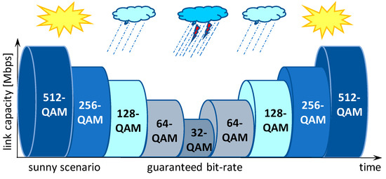 - Li, H.; Zhang, J.; Hong, Q.; Zheng, H.; Zhang, J. Exploiting adaptive modulation in E-band software-defined backhaul network. In Proceedings of the 8th Annual Computing and Communication Workshop and Conference (CCWC’2018), Las Vegas, CA, USA, 8–10 January 2018; pp. 1009–1013. [Google Scholar]