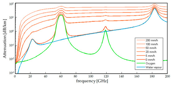 - Rec. ITU-R P.676-(3)-12. Attenuation by atmospheric gases and related effects. In P Series, Radiowave Propagation; International Telecommunication Union: Geneva, Switzerland, (1990)–2019. [Google Scholar]