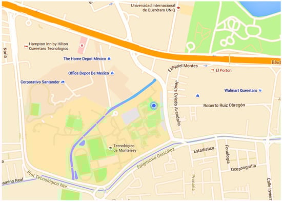 We used The ONE simulator, which is a virtual environment designed to test opportunistic networks [33]. The test scenario, delimited by a 1000 m by 1200 m squared terrain (Figure 4), was a portion of Queretaro City, a medium-sized state in Mexico, with little over 2 million inhabitants. The main simulation was done with DLR+, and we tested against four popular routing protocols: The epidemic router, the spray and wait router, the PRoPHET router, and the Seer router, from the flooding-based, probabilistic, and AI-based categories, respectively, as explained in Section 2. The simulation period was 43,200 s (12 h).