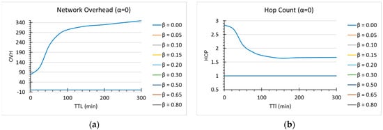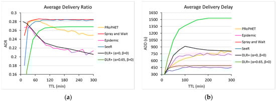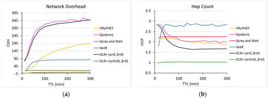 As can be seen in Figure 7a, DLR+ (α = 0.65) offers a greater PDR than the epidemic router and PRoPHET for TTL greater than 60 and 130, respectively. Although its performance on this metric is not the best, it is very close to those who offer the best values, only about 6.07% below its better counterparts. On the other hand, with α = 0, DLR+ outperforms all routers in PDR for TTL < 25. This reflects an interesting dynamic in the response of DLR+ for this case, in contrast with other routers: The more TTL is provided, the more inefficient the router becomes; however, as TTL is smaller, the response of the proposed router increases, outperforming the other routers in this metric. There is a tradeoff, nonetheless, in this range of operation, because in this part, DLR+ (α = 0) does not have the best performance in network overhead and hop count (Figure 8), although it shows acceptable values, very close to the ones generated by other routers.