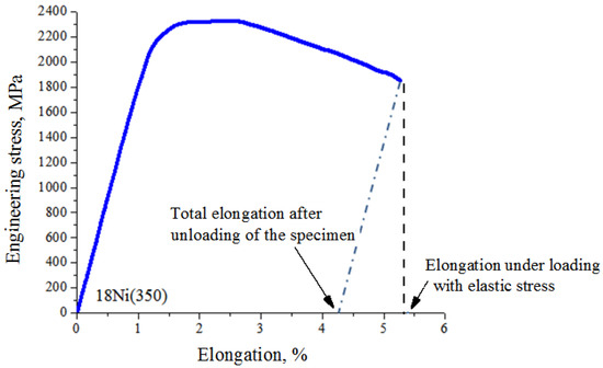 Stress–strain curve of 18Ni(350) (solution heat treatment: 820 °C for 1 h; aging treatment: 510 °C for 4 h).