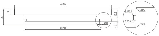where Dc = 176 mm is the calculated diameter of the flat cover; k = 0.25 is the structural characteristic coefficient; Pc is the calculated pressure, which can be 1.4 times the designed working pressure, i.e., 1.4 × 113 = 158.2 MPa; [σ]t = σy/1.5. In order to make the strength safety factor larger, the yield stress applied by the designer presently is reduced to a lower level, 1900 MPa, then [σ]t = 1266.7 MPa; ϕ = 1.0 is the welding coefficient. This value of δp = 31 mm is obtained in calculation but was 32 mm in practice, including the thickness of 12 mm in the part of Φ190 mm and the thickness of 20 mm in the part of Φ150 mm, as shown in Figure 3. Necessary verification has been conducted by designers to check the strength and stiffness of the structure and it is considered to meet the requirements.