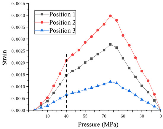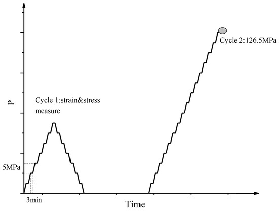 The spherical adjustable tank with its sealing cover was put into a high pressure chamber to examine its strength by pressure test before application. The pressure test was conducted in the high pressure chamber of the HAST laboratory at Shanghai Ocean University. There was no real-time video monitoring equipment in the pressure chamber and the test was carried out in several steps of cyclic pressure in order to stop and examine it periodically. The scheduled loading scheme is shown in Figure 4. A shorter load cycle was done before formal test. The maximum pressure set for this cycle was 75 MPa. The ultimate goal of the pressure test was to check if the tank could endure the external pressure of 126.5 MPa (i.e., 115 MPa for the 11,000 m deep-sea environment times a safety factor of 1.1 for pressure testing). After test preparation, the tank with strain gauges pasted outside the shell in three typical positions was sent to the pressure chamber, then the first cycle for watertight and insulation tests combining with strain and stress measurements was conducted. The loading phase was carried out gradually with the step of pressure increase of 5 MPa and maintained for 3 min in the loading and unloading stage. It was presumed that when the first cycle was finished, the tank should be taken out from the pressure chamber for a further inspection. If there was no problem, the tank was sent to the chamber for a final test.