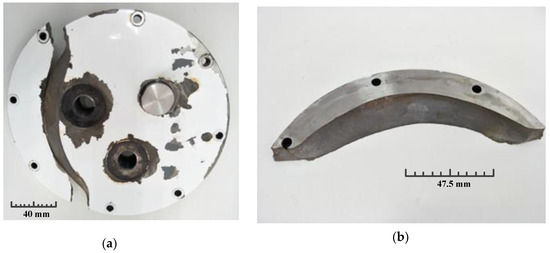 Photography of the cracked flat cover: (a) upper surface of the cover; (b) fracture surface in the outer edge of the cover.