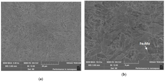 Microstructure and morphology of the flat cover material were observed and analyzed by TESCAN VEGA3 XMU scanning electron microscopy (SEM). Figure 9 shows the SEM low and high magnification microstructures of the specimens. The martensite structure of the material was uniform, and a small amount of precipitated phase particles could be seen at the grain boundary.