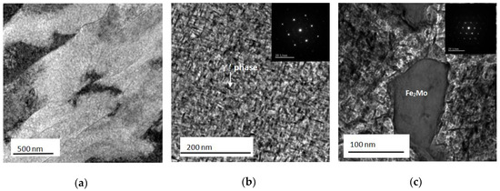 TEM microstructure of sealed top cover sample: (a) low magnification; (b) high magnification; (c) precipitated phase Fe2Mo morphology.