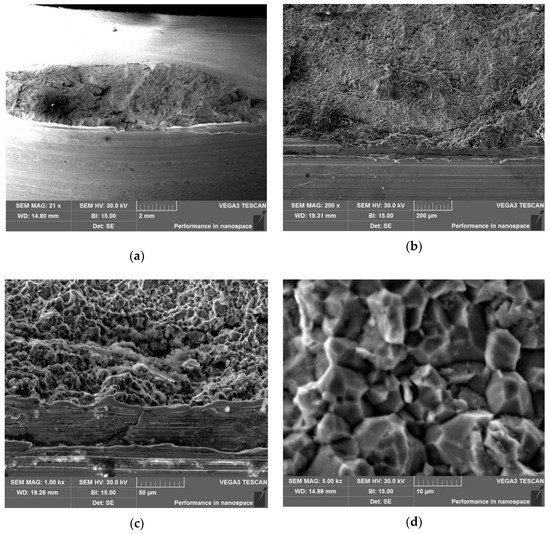 The fracture surface morphology was observed and analyzed by scanning electron microscopy after ultrasonic cleaning of the sample. Figure 11 shows the fracture morphology in the vicinity of the fracture source. It can be seen at the low magnification (Figure 11a,b) that the crack source is located at the root of the transition between the upper cover and the edge liner. It can be seen at high magnification (Figure 11c,d) that the crack source has an intergranular morphology and shows brittle fracture. During the external pressure test, the flat cover was subjected to a large stress from the outside to the inside, and a large stress concentration was generated at the right-angle transition root in which a crack source was easily generated and resulted in fracture.