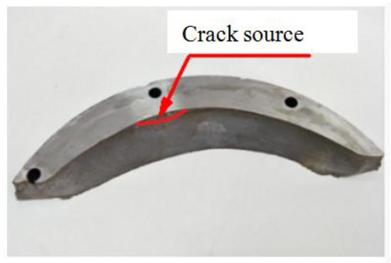 Based on the observations in Section 3, it can be concluded that the final fracture of the flat cover is due to the large stress concentration generated at the right-angle transition root of the thicker central part and the thinner edge. A crack initiated from this point is shown in Figure 13. It was initiated from improper manufacture and has the length of 3 mm and the depth of 1.5 mm. Final failure easily occurs because the material has low impact and toughness properties. A presumed semi-elliptical surface crack is considered in this section to analyze the failure mode of the flat cover during loading process. The fracture criterion is that the stress intensity factor at the crack tip reaches the plane strain fracture toughness of the material.