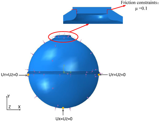 SolidWorks software was used for three-dimensional modeling, and ABAQUS software is used for finite element analysis after modeling. C3D8R element is used for meshing. Local mesh encryption was made in the vicinity of key chamfers of the flat cover and contacts the part between the spherical model and the flat cover, with mesh size of 1 mm, compared to the mesh size of 20 mm in other parts. The small chamfer was not included in the calculation model, because when the crack was inserted into the model, the stress concentration at the crack tip would be the dominant factor, and the stress concentration at the small chamfer was no longer important. The whole structure model was used in finite element calculation to obtain the critical stress area and the surface crack was inserted into the local model after stress analysis. Figure 15 gives the whole model for stress analysis. The ballast tank used in the deep-sea submersible was subjected to uniformly distributed hydrostatic pressure, which was applied both in the spherical shell and the flat cover. In order to eliminate the overall rigid body displacement without hindering the relative deformation, the boundary conditions were set symmetrically with six displacement components constrained by the three-point support method recommended in [22]. The contact surface between the flat cover and the sphere was set as the friction contact with the friction coefficient of 0.1.