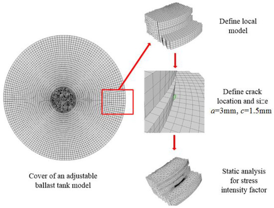 When a crack is simulated, the crack will be inserted into a sub-model. The sub-model was taken out separately for the study. The calculation can be conducted by using the connection between the global model and the sub-model, thus greatly reducing unnecessary computation and time costs. According to the results of previous failure observations, the defective part of the cover is treated as a sub-model and the crack with the length of 3 mm and the depth of 1.5 mm is inserted into the model. After static analysis, the stress intensity factor of crack front can be obtained. The position relationship between the sub-model and the global model is shown in Figure 16.