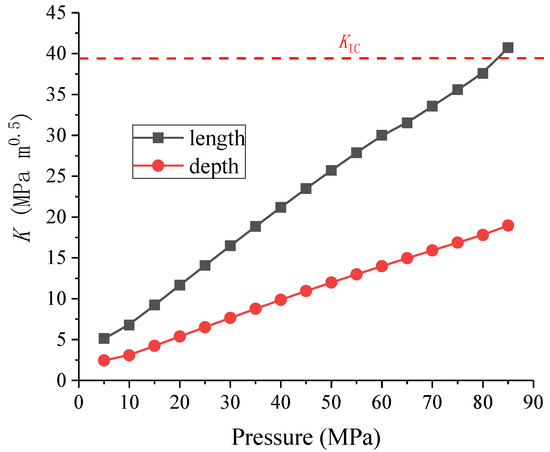 When the flat cover is subjected to different external pressures from 5 to 85 MPa, the stress intensity factors of the crack can be obtained. Figure 17 depicts the stress intensity factors along the crack front with increasing the external pressure. Figure 18 shows the changing of the stress intensity factors at the surface points and the deepest point with the external pressure. The stress intensity factor in the length direction is larger than that in the depth direction. The maximum value of the stress intensity factor occurs at the surface points. When the external load increases to about 75–85 MPa, the stress intensity factor at the crack tip reaches 35–42 MPa·m1/2, i.e., approximating to the value of fracture toughness, 38 MPa·m1/2, shown in Figure 14, which is the ultimate cause of the damage.