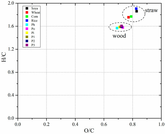 Van Krevelen diagram of biomass samples with the atom ratios of H/C and O/C from the ultimate analysis results.