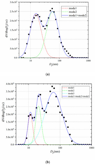 The PNSDs of aerosols are influenced by short fluctuations in different kinds of emission sources [41], which can be a part of data set in source apportionment of aerosol particles. In the PNSDs, two modes were identified with Dg about 20 nm and 100 nm from transit traffic and household heating, respectively [42,43]. As a major source of fine particles in the atmosphere, the size distributions of freshly emitted smoke particles from biomass burning resided mainly within the accumulation mode, with Dg at 50–200 nm [2]. The discrepancy of Dg and distribution pattern related to fuel type, combustion environment and conditions, and the aging process [44]. For different kinds of biomass samples, the PNSDs of smoke from smoldering burning were quite different with each other and from results from other researchers [15,45,46,47,48,49]. As shown in Figure 4, the PNSD of soya has two modes, which can be fitted with a bimodal lognormal distribution. Meanwhile, the PNSD of P2 can be fitted with a trimodal lognormal distribution, which has three modes.