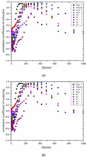 The scattering and extinction coefficients (Mm−1) would be changed with particle number concentrations of smoke. SSA is near 1 for smoldering smoke, which means light scattering is much stronger than light absorption. Therefore, the bulk optical properties of smoldering smoke are also related to the particle sizes for different kinds of smoke [21,52]. To set up the relationship between optical properties and PNSDs, the PCCs of bulk optical properties (extinction and scattering coefficients) and particle number concentrations of different sizes were analyzed. We show the correlation coefficients between extinction coefficients/scattering coefficients and particle number concentrations of different sizes for smoldering smoke from biomass burning in Figure 5. For soya, the extinction coefficient has strong correlations with particle number concentrations of sizes from 87 nm to 316 nm (PCC > 0.8). The size ranges of strong correlation are from 154 nm to 365 nm for wheat (PCC > 0.8), from 205 nm to 487 nm for corn (PCC > 0.8), and from 205 nm to 316 nm for rice (PCC > 0.8), respectively. The size ranges of strong correlation are changed from 154 nm to 422 nm for Ph (PCC > 0.8), from 178 nm to 649 nm for Po (PCC > 0.8), and from 205 nm to 316 nm for P2 (PCC > 0.8), respectively. The extinction coefficient has relative strong correlations with particle number concentrations of sizes from 274 nm to 422 nm for Pi (PCC > 0.6), and from 237 nm to 365 nm for P1(PCC > 0.5). The scattering and extinction coefficients showed similar trends for smoldering smoke. Therefore, the correlation of the scattering coefficient and particle number concentrations of different sizes is similar to that of the extinction coefficient. The flow rate of DMS was changed in the measurements of smoldering smoke of P3, and the relationship between extinction coefficients/scattering coefficients and particle number concentrations was not matched, so the results of P3 are not displayed in Figure 5. As a conclusion, the bulk optical properties of smoldering smoke have strong correlations with particle number concentrations of sizes bigger than 100 nm.
