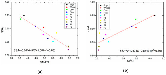 Correlation between SSA and the biomass components: (a) VM/FC; (b) N.
