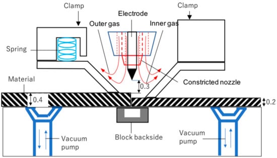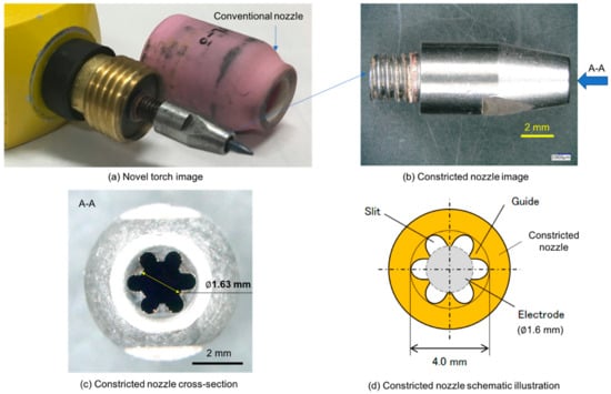 14] in the case of an anode of a water-cooled copper. The experimental results evidenced that in the case of TIG welding with a constricted nozzle, the oxygen content on the weld pool surface is lower in comparison to the conventional TIG welding process. In another paper, Anh et al. performed experiments in practical welding conditions at industrial factories. This paper indicated that thin sheets of 0.1 mm can be welded with sound quality at an extremely short distance of arc length (0.1 mm), high welding speed and low welding current with no surface defects such as undercut and burn-through [