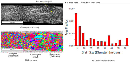 Figure 6a indicates the butt position of the joint. In this case, no welding defects, such as circular black shadows were observed. It seems that there was a small change in grain size distribution from the base metal toward the weldment. Fine grains were seen on the base metal side. In the heat affected zone (HAZ), coarse grains can be seen. The grain size is distributed within 5–80 microns, and the average size is about 30 microns.