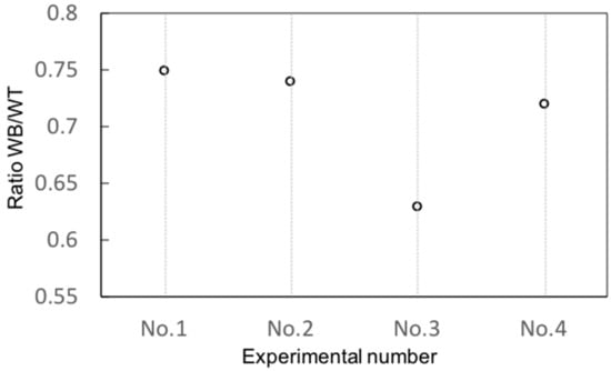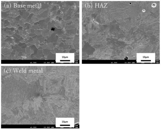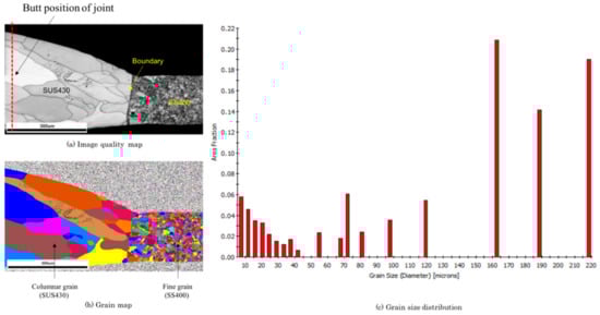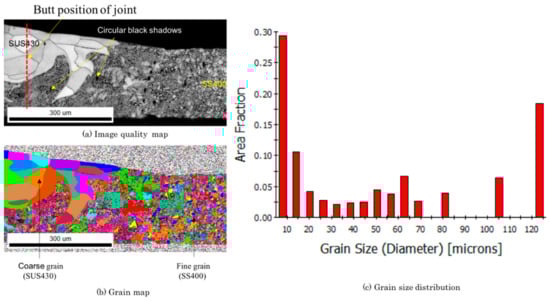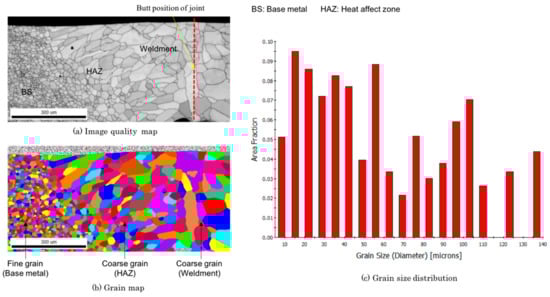 Figure 8a indicates the butt position of the joint. It seems that no circular black shadows were observed at both the weldment and HAZ in this welding condition. However, because SUS430 is a ferritic stainless steel, the grains size distribution is largely changed from the base metal toward the weldment. The grains were fine at the base metal. The grains coarsened at the weldment and HAZ. A large grain distribution within 50–140 microns can be seen.