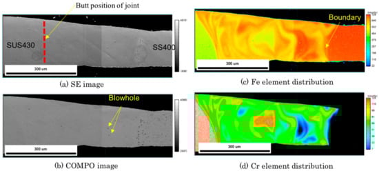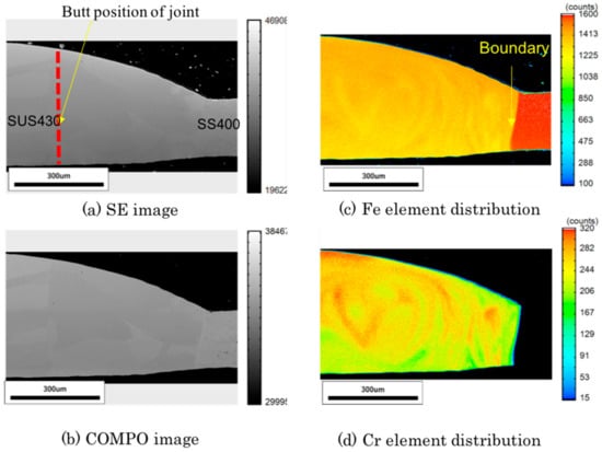 Figure 12d indicates that Cr was distributed on both the SUS430 material side and the weld zone. However, Cr element was not observed at SS400 material. A boundary between the weld zone and the SS400 material was clearly observed (see