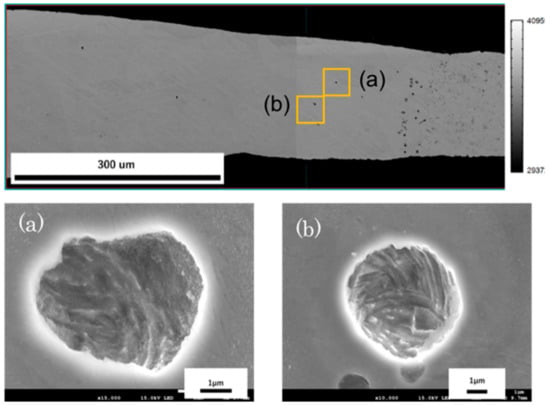 Figure 9a indicates the butt position of the joint. In this case, circular black shadows can be seen and they are concentrated at the SS400 material side. In addition, it can be seen that the mixture of the materials in the melting zone is not good. The SUS430 material was created a layer on the top surface of the SS400 material. However, on the bottom surface, it seems that only SS400 materials can be seen. The grain on the SS400 side is fine meanwhile it is coarse on the SUS430 side. Furthermore, it seems that no intermetallic layer was formed in this case.