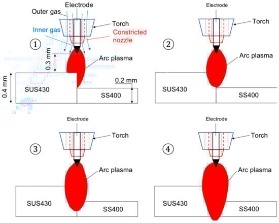 11]. Therefore, it leads a concentrated plasma flow with a high-speed plasma jet and high arc pressure impinging on the base metal surface. In addition, it accelerated the plasma jet through a high-speed inner gas flow, as mentioned above. Therefore, (1) the magnetic field acting on the arc; (2) the energy density of the arc plasma; and (3) the discharge capacity of electrons are increased strongly in comparison to the TIG welding process using a conventional TIG torch [