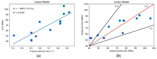 The obtained simple regression model that could predict UCS beginning from the independent variable (vp) and fitted to the values of Table 3 is shown in Equation (17):