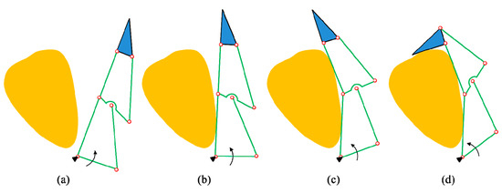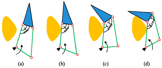 As we mentioned earlier, underactuation can be achieved through using passive elements such as springs and mechanical stoppers. First, a demonstration of the closing sequence of a two-phalanx robotic finger is shown in Figure 1 to clearly understand the working principle of underactuation. This finger is actuated by the lower link indicated by the arrow. This finger has two phalanxes, whereas only one actuator is used for control. The spring and mechanical stopper are used to constrain the relative motion between the two phalanxes. First, before the proximal phalanx makes physical contact with the object to be grasped, the whole finger moves as a single rigid body, as shown in Figure 1a,b. Second, when the proximal phalanx makes physical contact with the object, it stops its movement. In this case, the actuation toque overcomes the preloading of the spring, and the distal phalanx continues to rotate [as shown in Figure 1c] relative to the proximal phalanx until it also makes physical contact with the object [as shown in Figure 1d]. It is noted that the finger closing sequence is automatically generated by continuous actuation of the lower link, as indicated by the arrow.