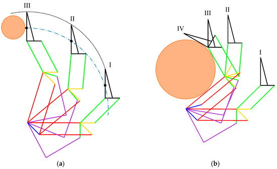 During the parallel-grasping sequence, the entire finger moves as a single rigid body to perform the open-close motion. Thus, point K shown in Figure 9a will follow a circular trajectory with its rotation center located at point A. Because the orientation of the distal phalanx remains constant during the open-close motion, all its points have the same instantaneous velocity. By defining a virtual parallelogram () shown in Figure 9a, we know that the contact point P follows a circular trajectory with its rotation center located at the virtual point .The motion of contact point P during parallel grasping is shown in Figure 9b. The velocity of contact point P is the same as the velocity of point K, which can be derived as