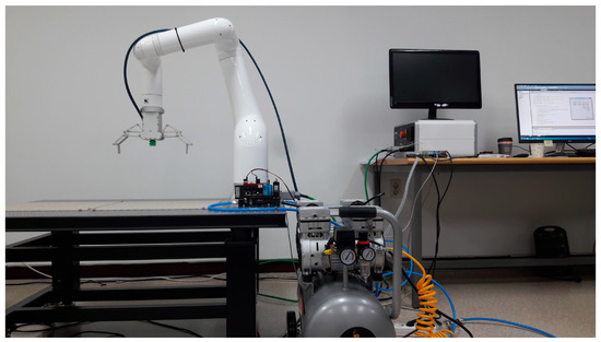 The suction-grasping system consists of an air compressor, an ejector, a filter, a vacuum cylinder, and a suction cup. The vacuum-lifting cylinder attached to the gripper palm has an 80-mm stroke. Figure 5 shows that when the two robotic fingers stay at an open configuration, suction grasping can be performed to grasp objects in a cluttered narrow environment. The system overview of the multi-function grasping system including a six-DOF commercial robot arm, is shown in Figure 6.