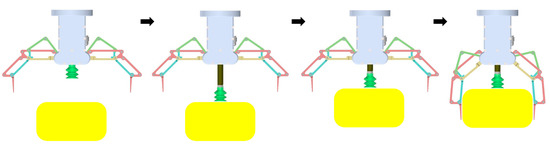 As explained earlier, conventional mechanical grippers/hands provide the advantage of achieving stable grasping in open space. Meanwhile, applying them in a cluttered narrow space is difficult because multiple physical contacts might occur. In comparison, the suction grasper offers the advantage of grasping objects in a cluttered narrow environment. Meanwhile, pure suction grasping is generally unstable because the suction cup is too soft to maintain the configuration of the grasped object. Hence, combining the mechanical gripper/hand with the suction grasper is an efficient method to grasp general objects in different types of working environments. The grasping sequence of this multi-function gripper is shown in Figure 11.