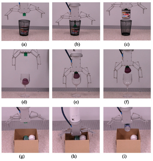 As explained earlier, two motors are required to control each underactuated finger. One motor is used to control the open-close motion, and the other one is used to control the orientation of the distal phalanx. When both the two fingers are simultaneously controlled to perform the open-close motion and no external contact occurs at the proximal linkages, parallel grasping can be achieved, as shown from Figure 8a–c. It is noted that to make sure that these two independent fingers can be synchronized during parallel grasping, initialization is required before performing a grasping task. Initially, we need to move the gripper to the home position where both of the two fingers are fully opened. Due to the mechanical limitation, after moving to the fully opened configuration, the fingers cannot move anymore, and the motor current will be increased rapidly. Then we use the current feedback from the motor to detect whether these two fingers move to the fully opened configurations or not. Because we can find the absolute position of each finger at the fully opened configuration from the 3D model, we can control the synchronization of the two fingers. Video attachment demonstrates how motion synchronization is achieved.