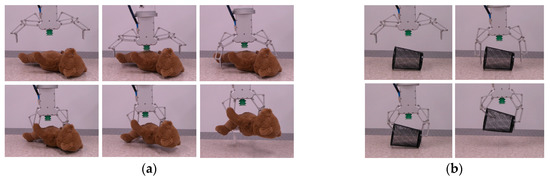 The suction gripper cannot stably grasp heavy objects that lie in a narrow space. In this case, the combination of suction and linkage-driven grippers will be an efficient method for achieving stable grasping. Figure 18a shows an example of grasping a 1.35 kg dumbbell from a narrow space. Figure 18b shows how the multi-function gripper is used to grasp an object with a cone shape and that with an irregular shape.
