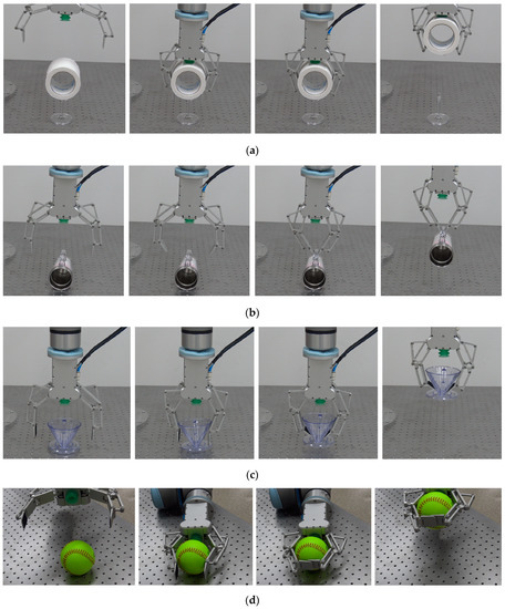 Moreover, Figure 17 shows how the pinch motion of the distal phalanx of the robotic finger is used to grasp different objects in different scenarios. The object shown in Figure 17a lies above the supporting base, i.e., there exists a spare space between the object and the base. Actively controlled pinch motion allows the finger to scoop the object up from the bottom side. Figure 17b shows using the closed distal phalanx to grasp a cup having a lifting ear. This kind of grasping mode is similar to caging [29,30]. Figure 17c shows how to grasp objects with a cone shape. Figure 17d shows one example of grasping though making contacts at both phalanxes and palm.