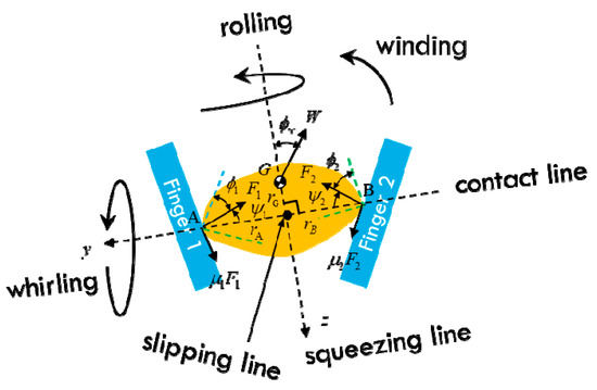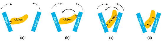 Different phases of two-finger grasping with only two contact points are shown in Figure 21. The two fingers will make contact with the object in sequence. From Figure 21b,c, we can see that the object is dragged by the finger during continuous closure movement. Figure 21d demonstrates the phase where a static grasp is achieved. In order to model these phases, the planar grasp model [33] for a two-finger gripper is shown in Figure 22. The static equilibrium condition of a planar grasp can be expressed in the directions of the contact and squeezing line as follows