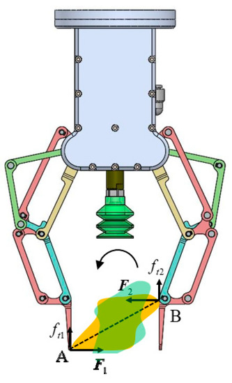 As far as the objects with irregular shapes are concerned, if the two contact points are not well selected, the static force equilibrium might not be achieved. One example is shown in Figure 24, where the two contact points A and B are relatively far from each other. During applying the contact forces, the configuration of the object might be changed (Initial configuration of the object is indicated by yellow color; the new configuration is indicated by transparent green color) because the two contact forces do not coincide, a winding moment will be produced on the object. After continually applying the grasping force, it is not sure whether the static equilibrium between two fingers can be achieved or not. In this case, a multi-contact grasping generally is required for achieving stable grasping. For certain objects to be grasped, the grasping mode and grasp contact points should be carefully selected. It is also possible to increase the grasping stability by adding an appropriate compliant structure to the fingertip because the compliance increases the ability of a gripper to conform to the shape of the object being grasped, and also increases the area of the contact patches, increasing the grasp wrench space [37].
