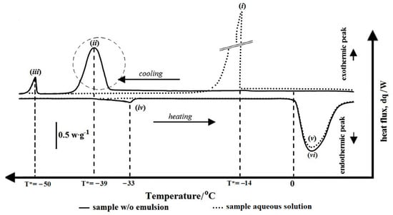 Figure 2 shows the thermogram of a bulk aqueous phase (in dotted line) and a sample W/O emulsion (in solid line). During the cooling process from 30 to −60 °C, water freezes at different temperatures depending on their size. For 30 mg of the sample aqueous solution with diameter, Ø = 1 mm, a mean freezing temperature, T* is found at −14 °C (Figure 2, i). For 30 mg of the sample W/O emulsion with a mean droplet size distribution, D43 = 4 μm, T* is found −39 °C (Figure 2, ii), while the oil continuous phase freezes at T* = −50 °C (Figure 2, iii). During the heating process, the temperature returns to the initial one, all the water melts at the same temperature, namely Tm = 0 °C, as seen in Figure 2, v for the water dispersed droplets of sample emulsion and Figure 1B, vi for the bulk aqueous phase. And the melting temperature of the oil continuous phase is found at Tm = −33 °C (Figure 2, iv). According to Clausse et al., 2014 [23], freezing is the result of nucleation phenomena, temperature variations can induce a change in morphology, consequently, all the water droplets do not freeze at the equilibrium point, so their freezing temperatures are scattered.