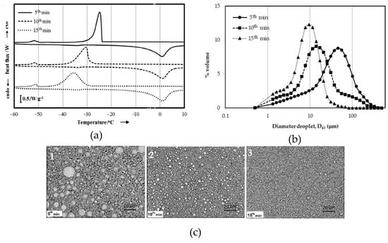 At the lower speed, 3000 rpm, the water and oil phases are disrupted and intermingled. By increasing the shearing speed to 6000 rpm, the droplets started to form. The freezing temperature was found at T* = −15.4 °C (Figure 3a, solid line), however the exothermic peak is still located around the bulk aqueous phase. The shape of the peak is sharp which implies that a large amount of water has frozen at the same time, so the energy is released in a very short time. In line with the increasing of the shearing rate to 10,000 rpm, the T* moves to the lower temperature −15.8 °C (Figure 3a, dashed line) with the tail shifted along with the lower temperature. It reflects the droplets not being completely emulsified yet. As the rate attains to 14,000 rpm (Figure 3a, dotted line), the disruption leads the larger droplets to the smaller ones. Two peaks are found in the thermogram, namely T* = −21.3 °C and T*= −27 °C, which indicate that the polydispersed population of the droplets with the presence of large droplets dominated the emulsion system. The peak at −51 °C is the solidification of the oil phase. The volume mean droplet size distribution, D43 decreased step by step from D43 = 488 μm at 6000 rpm to D43 = 451 μm at 10,000 rpm then to D43 = 153 μm at 14,000 rpm. The microscopic observation shows that the distribution of the droplets is in a heterogeneous population, but a small population of large droplets begin to present as the speed increased.