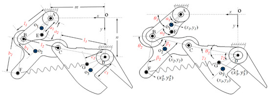 The o-xy coordinate system is established as shown in Figure 2. Origin O is the point at which the x-axis crossing hinge point A intersects the y-axis crossing hinge point D. The x-axis is defined along the horizontal leftward direction, and the y-axis is aligned with the global gravity vector. A, B, C, and D represent the hinge points between the three linkages. E denotes the action point of the unlocking force. F and G are the application points of the spring. represents the center of gravity of the ith component.