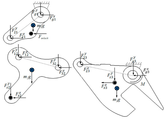 Here, is the unlocking force; is the force from the ith component to the jth component in the x direction; is the force from the ith component to the jth component in the y direction; is the spring force; is the force from the spring to the jth component in the x direction; is the force from the spring to the jth component in the y direction; is the force from the lock bracket to the jth component in the x direction; and is the force from the lock bracket to the jth component in the y direction.