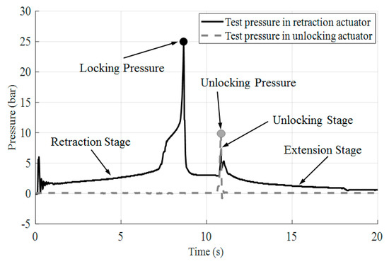 In order to examine the locking performance of hook lock, retracting and locking performance tests were carried out on the landing gear. Figure 4 illustrates the pressure results from the test, where the solid black curve represents the pressure in the rodless side chamber of retraction actuator, and the gray dashed line represents the unlocking pressure of hook lock. During retraction of the landing gear, hydraulic pressure is supplied to the rodless side chamber of retraction actuator. As the pressure rises, the landing gear is retracted slowly. When the pressure reaches the peak, it indicates that the lock roller hits the lock hook to complete the locking action. This peak value is precisely the critical impact force at which the hook lock can complete the locking action. By measuring and calculation based on the test pressure curve, the locking moment can be obtained that . During extension of the landing gear, the hook lock is unlocked initially to release the landing gear. At this point, the hydraulic system supplies pressure to the unlocking actuator, and the peak pressure site is precisely the critical driving force that enables unlocking of the hook lock. Calculation based on the measured pressure curve = 82.4 N.