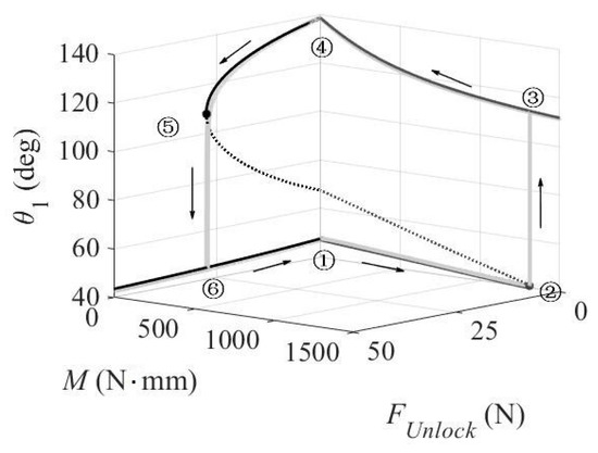 In Figure 5, the black line represents the locking process, where , and the dark gray line represents the unlocking process, where M = 0, namely, . Here, the unlocking process is studied first without considering the influence of gravity on the landing gear temporarily. Detailed discussions will be given in the following section. Meanwhile, the solid line represents the stable equilibrium point, and the dotted line represents the unstable equilibrium point. If the system undergoes a small disturbance near a stable equilibrium point, it will converge to the stable point. Moreover, if the system suffers a small disturbance near an unstable equilibrium point, it will immediately jump to a stable equilibrium point.