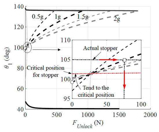 As is known, the upper lock mechanism should never be unlocked automatically, no matter how large the aircraft maneuvering overload. The lock mechanism can be unlocked automatically in the following case. When , if the position of lock mechanism linkage 1 is less than a particular angle, the lock mechanism can jump automatically to the unlocked state from the locked state, even in the absence of an external driving force. Taking the computational result of a 1 g overload as an example (thick black line), the specific angle at which the lock mechanism can be unlocked automatically is = 99° (the angle corresponding to the circular dot in Figure 7) in this scenario. That is, for the 1 g overload case, the position of the limit stopper should be greater than 99°.