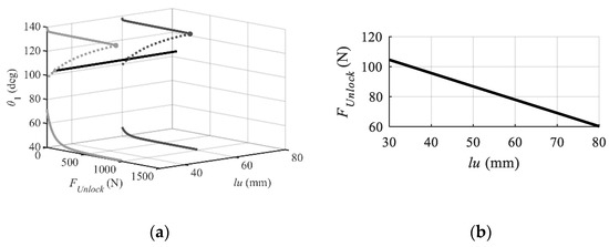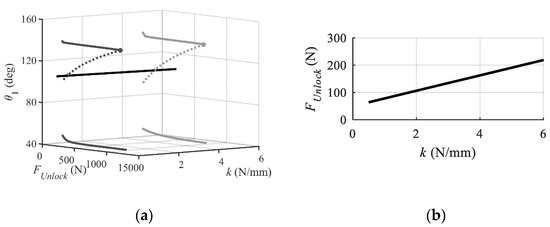Figure 8 and Figure 9 show how the unlocking force varies with the stiffness k and the original length lu of the spring, respectively. The results indicate that the influences of k and lu on the unlocking force are linear. The unlocking force increases monotonically with increased k values and decreases monotonically with increased lu values, while is more sensitive to changes in k than to changes in lu.