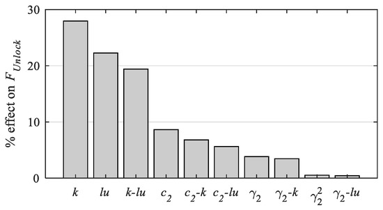 On the basis of the foregoing analysis of single parameter influence on the unlocking force , this section carries out the sensitivity analysis concerning the multi-parameter influence on . This not only allows visualization of the importance of various parameters, but also provides an analytical basis for the subsequent optimization computation of the unlocking force. Figure 12 displays the sensitivity analysis results. As is clear, the spring stiffness k, the original spring length lu and the cross term k-lu have higher contributions to the unlocking force, while the spring mounting position parameters and contribute less to .