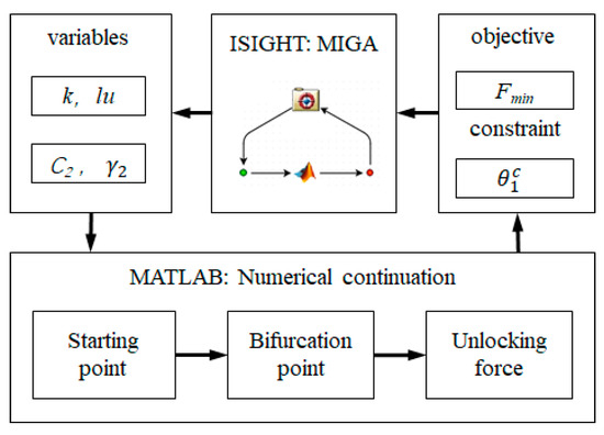 The optimization process is illustrated in Figure 13. First, the bifurcation analysis model is established in MATLAB, and the optimization analysis model, ISIGHT, is also constructed. Each optimization iteration is completed in the locked area of the mechanism. Initially, a set of design variables is generated randomly according to the rules of MIGA, which is then passed to MATLAB to determine the motion trajectory and bifurcation position of the lock mechanism using a numerical continuation algorithm with the single parameter of the unlocking force. As a result, it obtains the angle characterizing the locking ability and the unlocking force enacted by the limit stopper. Afterwards, is checked to determine whether it conforms to the locking ability requirement, and is examined for its validity as a comparison value. If is an invalid comparison value, a new set of design variables is generated directly to enter the next iterative computation. In addition, if is a valid value, a comparison is made with the previous computational result to check for convergence. When the convergence requirement is met, the optimization computation ends. Otherwise, the next iterative computation is initiated likewise until the convergence requirement is satisfied.