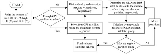 In the process of establishing the NSS model, the accuracy and characteristics of different constellations and satellite selection algorithms were all considered. As the first and well-known GNSS system that has been fully operational, GPS has better positioning accuracy and reliability when BDS and GLONASS are compared. Thus, to ensure the positioning accuracy of the NSS model, the maximum volume algorithm is applied in the GPS satellites because GDOP is inversely proportional to the volume and better GDOP can partly reflect the theoretical impact of the observational geometry. For the BDS and GLONASS satellites, they both have rather good coverage almost worldwide. Thus, we used two satellite selection algorithms (based on azimuth and elevation, respectively) in BDS and GLONASS to avoid the situation that excessive satellites are selected at some epochs if one algorithm is used. In this study, the fast-rotating partition satellite selection algorithm based on equal distribution of sky was adopted for the GLONASS satellites, which can greatly reduce the computation time when compared to the optimal DOP algorithm. Like the fast-rotating partition satellite selection algorithm, the elevation partition satellite selection algorithm is based on equal distribution of elevation. Additionally, we applied the elevation partition satellite selection algorithm in BDS. These three different selection algorithms formed the NSS model. It is succinct and fast because the huge amount of computation is reduced in the process of satellite selection. In addition, the considered characteristics of multi-GNSS can provide some assurance for the positioning accuracy. The flowchart of satellite selection is shown in Figure 3.