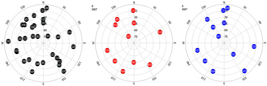 In the maximum volume algorithm, if the volume of a tetrahedron composed of four satellites is maximal, the four satellites are selected. In general, more than four satellites are desirable in order to degrade the effect of the measurement errors and increase the robustness of estimating navigation solutions [18,22]. Additionally, this method is time consuming due to a large number of about 24 visible satellites in multi-GNSS. For the optimal DOP algorithm, it often selects a set of satellites whose position dilution of precision (PDOP) or geometric position dilution of precision (GDOP) is minimal. However, it also has a larger computation load to a GNSS receiver. For instance, when 12 satellites are selected from 24 satellites, 2,704,156 () GDOPs or PDOPs need to be computed, which causes a massive and time-consuming computation when other satellite selection methods are compared. The highest elevation angle satellite selection algorithm is the simplest and the least time consuming, but it often has poor geometries. Compared with the optimal DOP algorithm, the fast-rotating partition satellite selection algorithm based on the equal distribution of sky can greatly reduce the computation time and has a similar performance in positioning. The accuracy of different systems is also different in the process of positioning [23]. Therefore, it may be inappropriate to apply the same algorithm to the satellites of different constellations in the satellite selection solution.