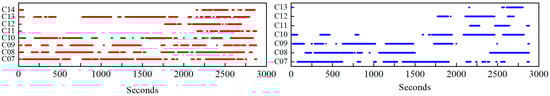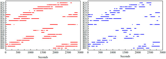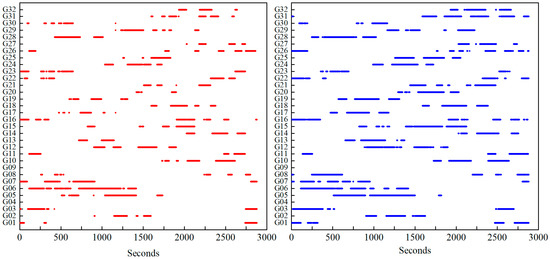 In the process of parameter estimation, the estimated values and variances of float ambiguity of all satellites are saved in a list which is continuously kept. Suppose the related information of satellite at epoch has been saved. From epoch to the epoch , satellite is not selected but continuously observed. At epoch , satellite is selected again. At this time, we add the previously estimated parameter and variance of ambiguity to the optimal estimation of the previous epoch. The method is not rigorous, but we can use it in actual situations. Taking the undifferenced and uncombined dual-frequency PPP model as an example. Satellite is selected at epoch and epoch . In addition, it is continuously observed from epoch to epoch while the total number of visible satellites is at epoch , then the transformation of the last best estimation (State matrix and Variance matrix) at epoch can be shown as follows. Equation (10) is the transformation of the best estimation for the state matrix. Equation (11) is the transformation of the best estimation for the variance matrix.