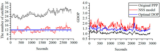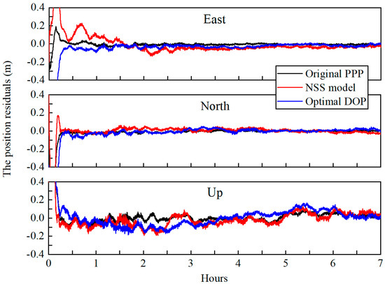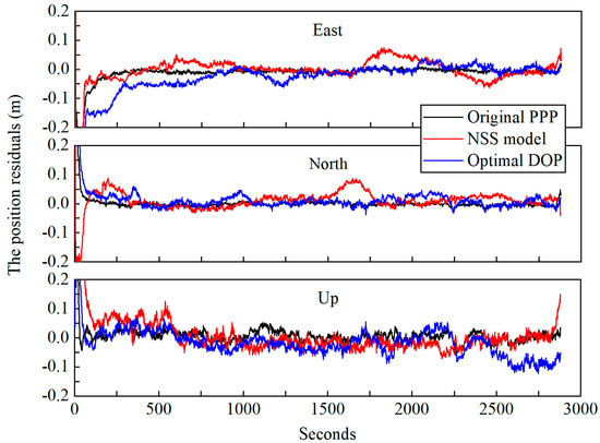 Figure 9 shows the position residuals of GPS/BDS/GLONASS kinematic PPP with undifferenced and uncombined observations in the East (E), North (N), and Up (U) directions. In Figure 9, it can be seen that the position residuals of the NSS model and the optimal DOP algorithm are similar, while the original PPP has a better accuracy at most of epochs, as the original PPP solution uses all visible satellites. To obtain the accurate position accuracy of kinematic PPP, we calculated the RMS of the position residuals based on the results after 10 min convergence. It can be known that the RMS of the position residuals of original PPP was 2.8 cm in the E direction, 1.1 cm in the N direction, and 1.9 cm in the U direction. The RMS of the position residuals was 2.9 cm in the E direction, 2.1 cm in the N direction, and 6.9 cm in the U direction with the NSS model. For the optimal DOP algorithm, the RMS of the position residuals was 6.3 cm in the E direction, 5.6 cm in the N direction, and 2.3 cm in the U direction. Thus, the RMS of the position error () is 3.6, 7.8, and 8.6 cm for the original solution, NSS model, and optimal DOP algorithm, respectively. It is clear that the GPS/BDS/GLONASS kinematic PPP with NSS model has a centimeter-level accuracy when the simulated kinematic data at the MGEX stations is used.