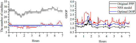 The above results mean that the computational load could be significantly reduced in undifferenced and uncombined GPS/BDS/GLONASS kinematic PPP with the use of the proposed NSS model. Additionally, the positioning accuracy of the NSS model PPP solution is still within the requirement and similar to the optimal DOP algorithm solution. This study can provide a reference for the application of satellite selection algorithms in real-time kinematic PPP in low-cost GNSS receivers.